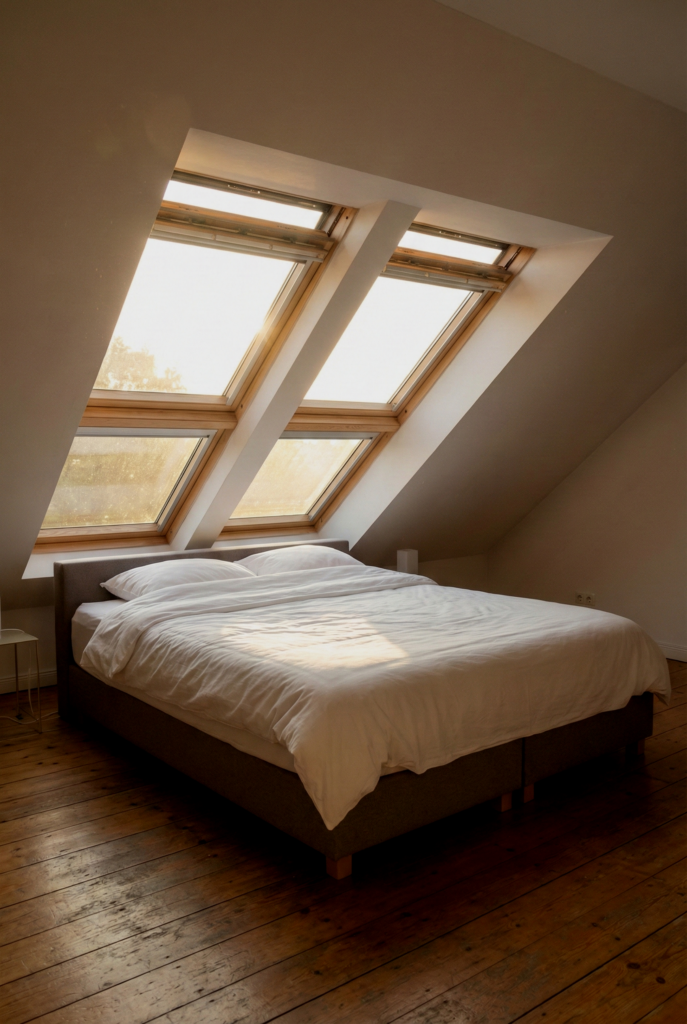Light is the biggest game-changer in an attic. If your budget allows, installing skylights (like Velux windows) instantly transforms a dark cave into a bright sanctuary. Positioning the bed directly under the skylight lets you stargaze at night—just make sure to install blackout blinds for the morning sun.