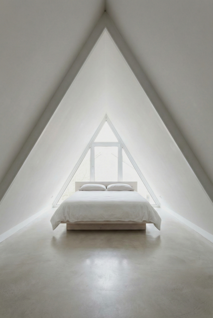 Symmetry is satisfying. In an A-frame attic, place the bed directly in the center under the peak. Keep the furniture minimal and low profile. The symmetry creates a calm, zen-like atmosphere that emphasizes the unique shape of the room.
