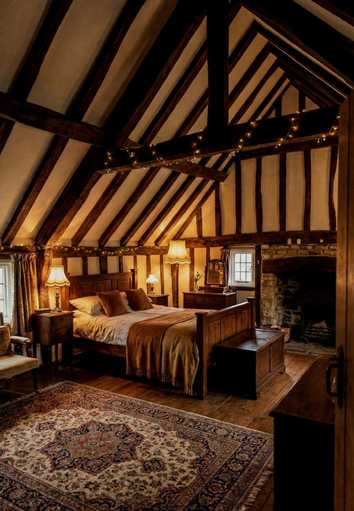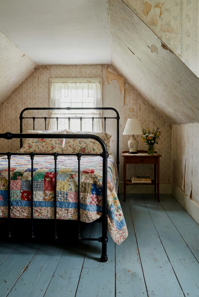 Attics often have a nostalgic feel. Lean into it with “Grandma Chic” or Cottagecore decor. Think wrought iron bed frames, antique quilts, painted floorboards, and floral curtains. It feels timeless and lived-in.