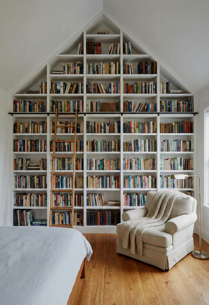 Have a gable wall with no windows? Fill it with books. Floor-to-ceiling shelves on the flat triangular wall create a stunning focal point and solve storage issues. A rolling library ladder adds serious character.