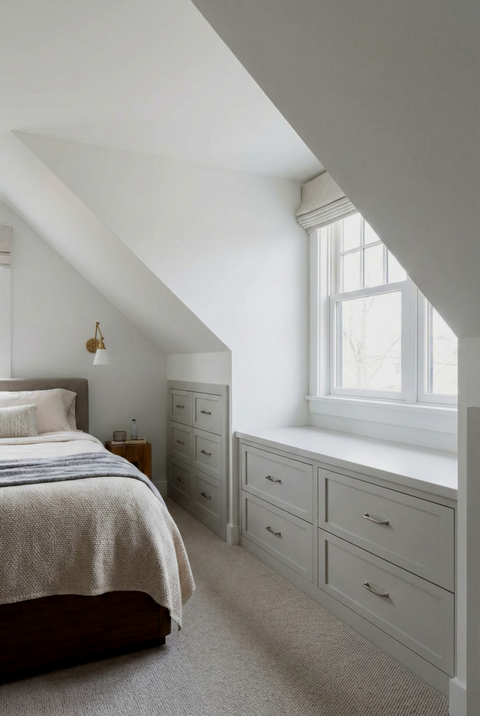 Don’t just push furniture against it. Build into it. Recessed drawers, sliding cupboards, or even open bookshelves built into the knee wall turn that dead triangle of space into valuable storage.