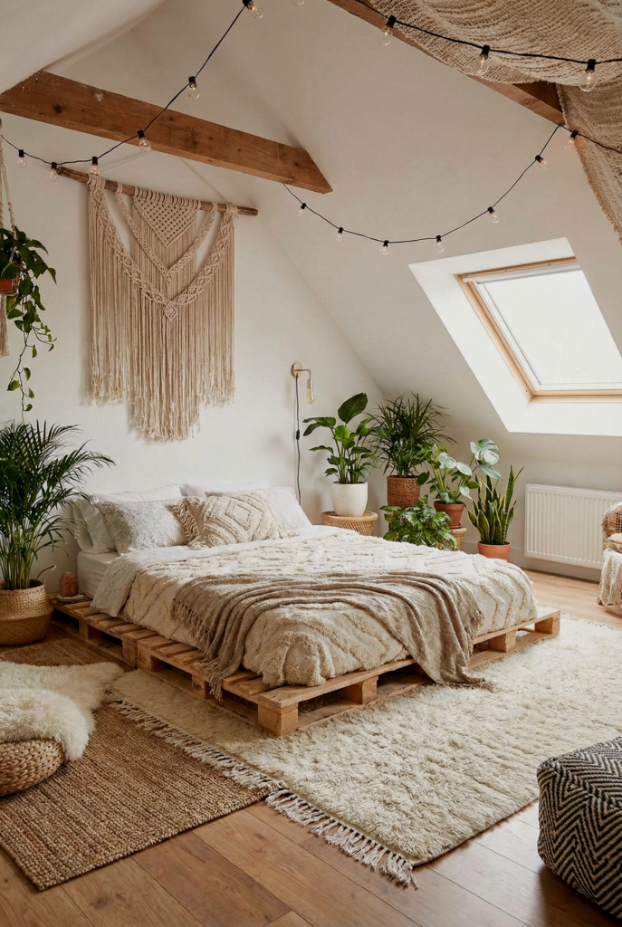 Low ceilings call for low furniture. This is where Boho style shines. Skip the box spring and put your mattress on a low platform or pallet. Add floor cushions, layered rugs, and hanging plants (which love the skylight sun). It feels intentional and relaxed.