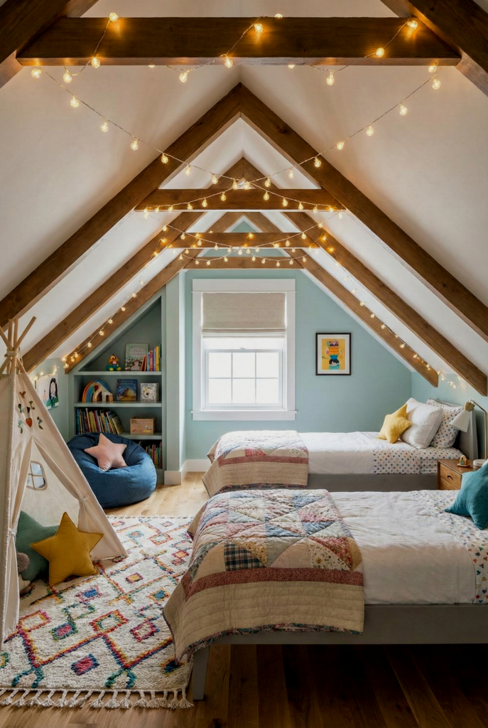 Kids love nooks. An attic with a low ceiling might be uncomfortable for an adult, but it’s magical for a child. Tuck twin beds into the eaves to create a cozy “sleeping pod” feel. Add fairy lights and soft carpet for a dream playroom/bedroom combo.
