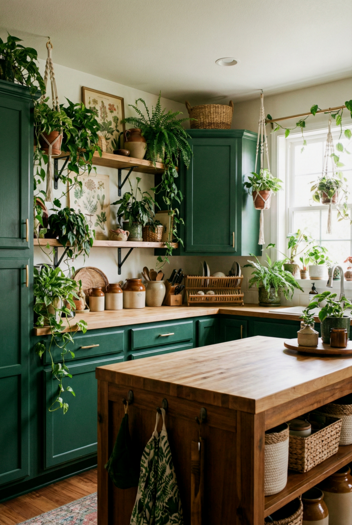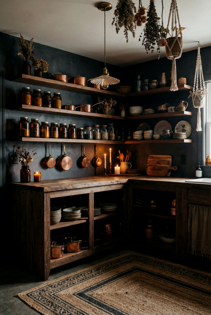 Boho doesn’t have to be light and bright. A dark kitchen—think charcoal or forest green walls—creates a cozy, “womb-like” feeling. Wood tones and brass hardware glow beautifully against the dark backdrop.