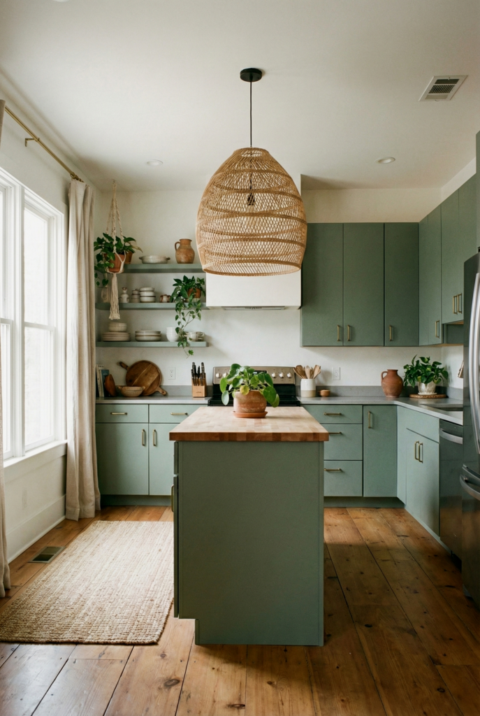 Sleek can be boho. The Modern Boho kitchen uses flat-panel cabinets (often in sage or matte black) and modern brass hardware. The boho element is usually a single statement piece, like an oversized woven light fixture or a vintage runner rug.
