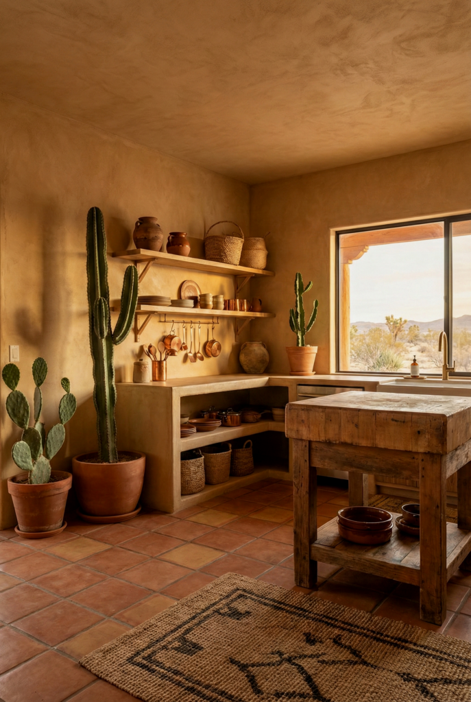 Inspired by the American Southwest, this style swaps white for warm earth tones. Think terracotta floor tiles, plaster walls in sage or sand, and cactus plants on the windowsill. It feels baked by the sun and incredibly grounding.