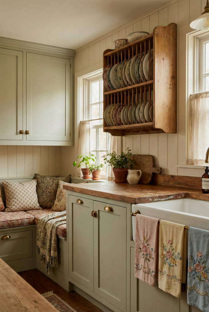 Cozy and cute. This looks like a grandmother’s cottage in the English countryside, but with a boho twist. Pastel cabinets (sage or butter yellow), plate racks displaying vintage china, and floral curtains.