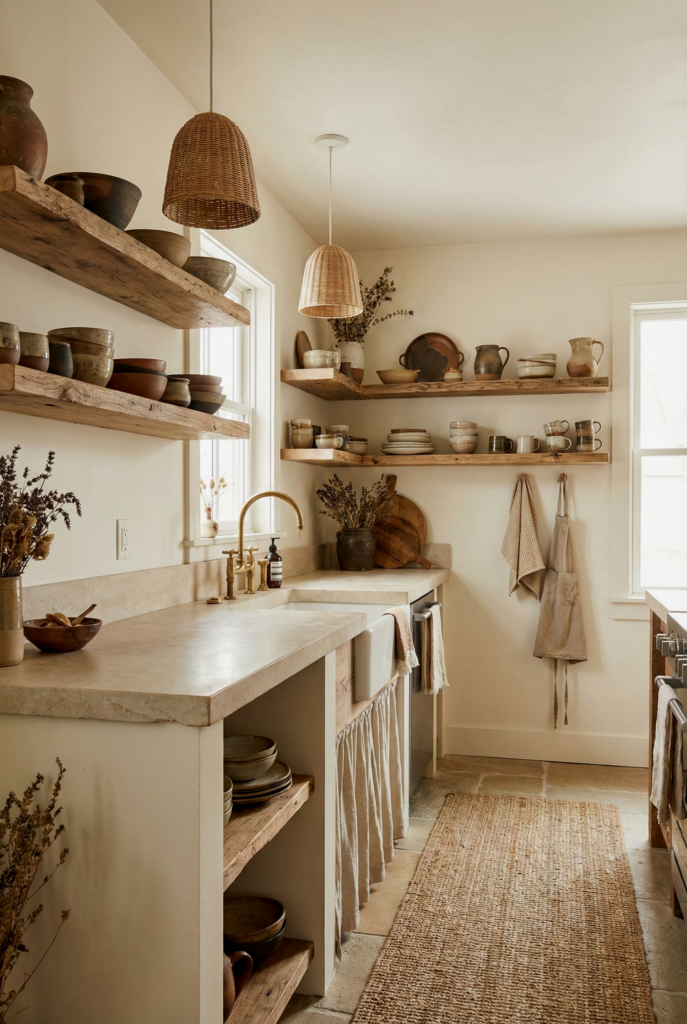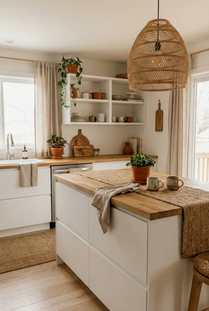 This is the gateway to boho. It starts with a Scandinavian base—white walls, light wood cabinets, and functional layout. The “Boho” comes in via texture: a jute rug, a rattan pendant light, and wooden spoons on display. It’s clean but not cold.