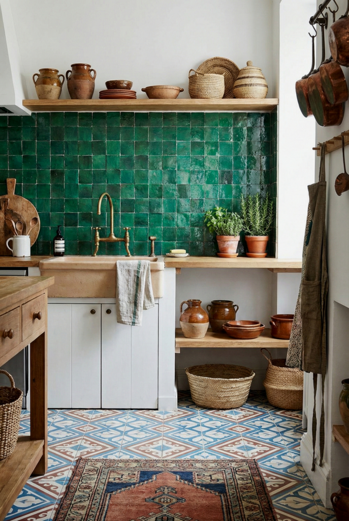 Global influence is key to boho style. Moroccan kitchens feature intricate Zellige tiles (handmade clay tiles with beautiful imperfections), brass faucets, and lantern-style lighting. It feels exotic and collected.