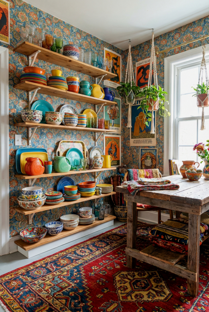 Nostalgia is a powerful ingredient. This style embraces the funkier side of boho. Mustard yellow backsplashes, dark wood cabinets, and retro patterns. It’s playful, warm, and unapologetically vintage.